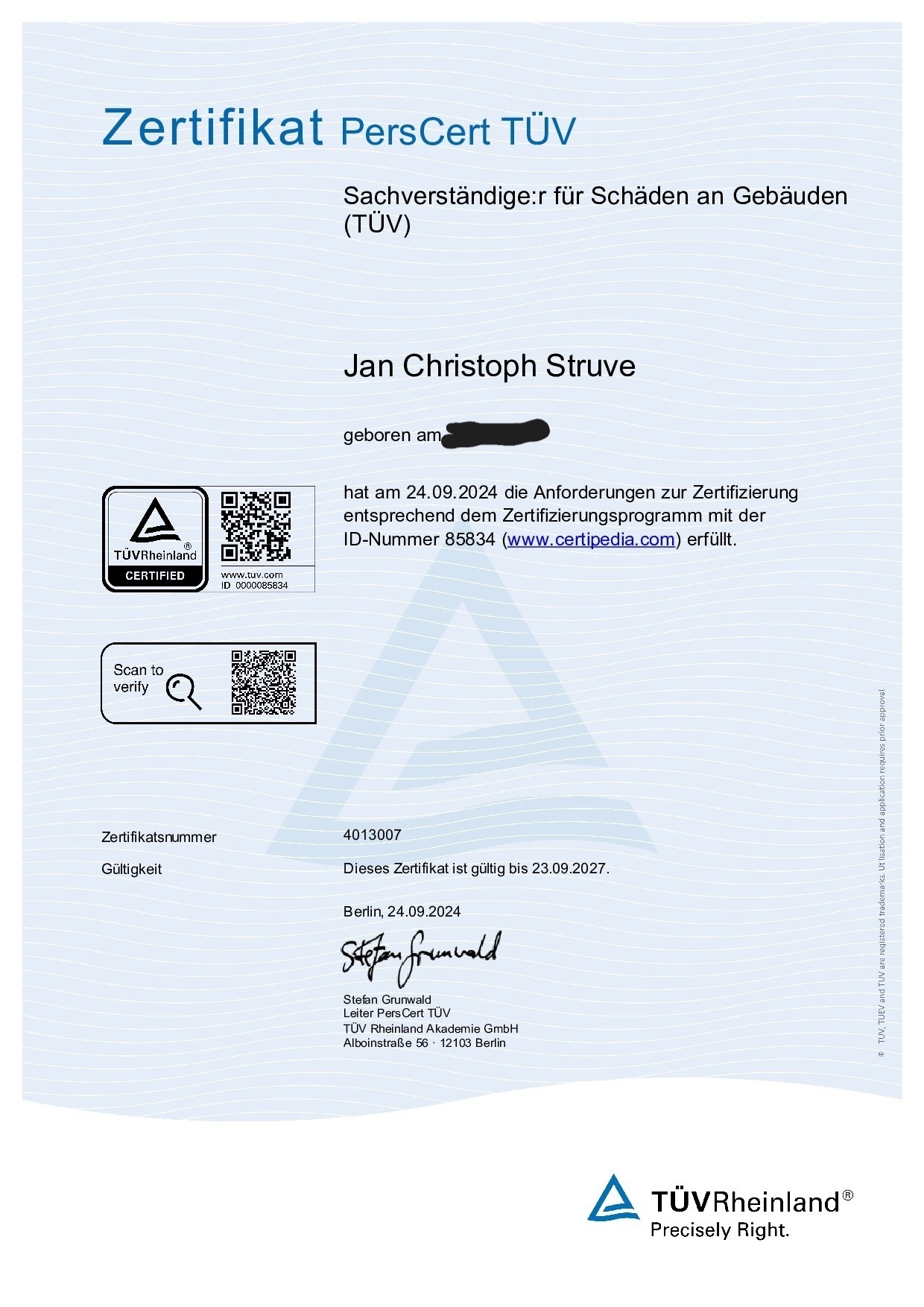 Bei all diesen und noch weiteren Fragen und Problemen bin ich als vom TÜV-Rheinland personenzertifizierter Sachverständiger Ihr Ansprechpartner.